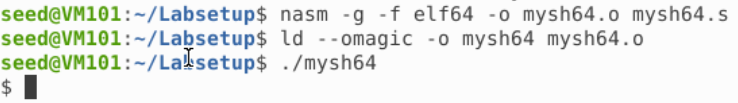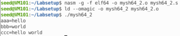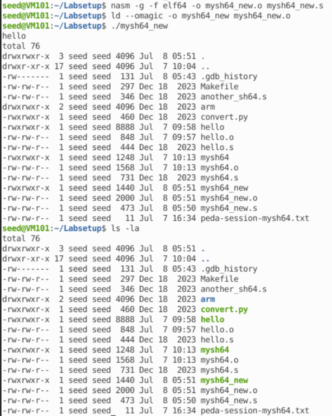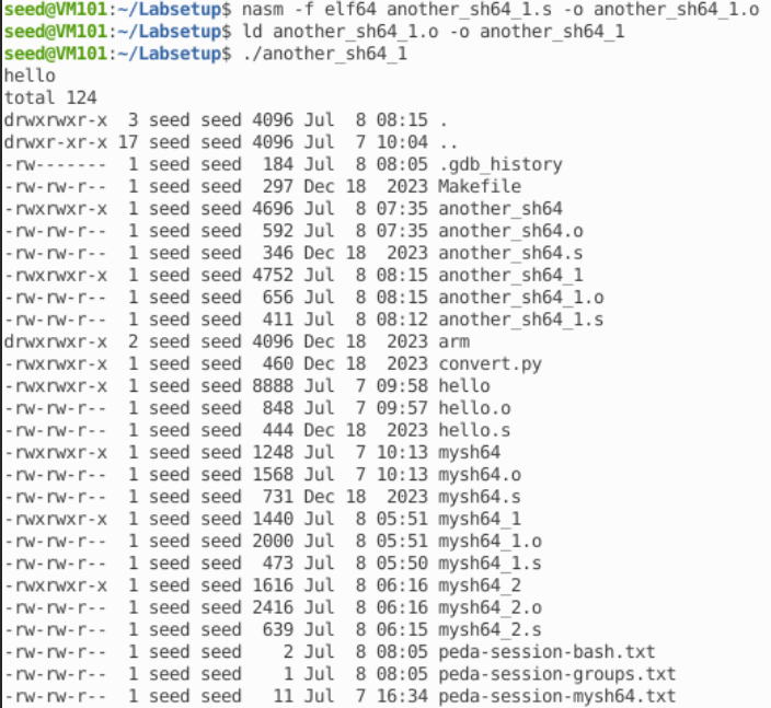 使用动态在栈上构造的方式,编写命令 /bin/bash -c "echo hello; ls -la" 的 shellcode 如下:
