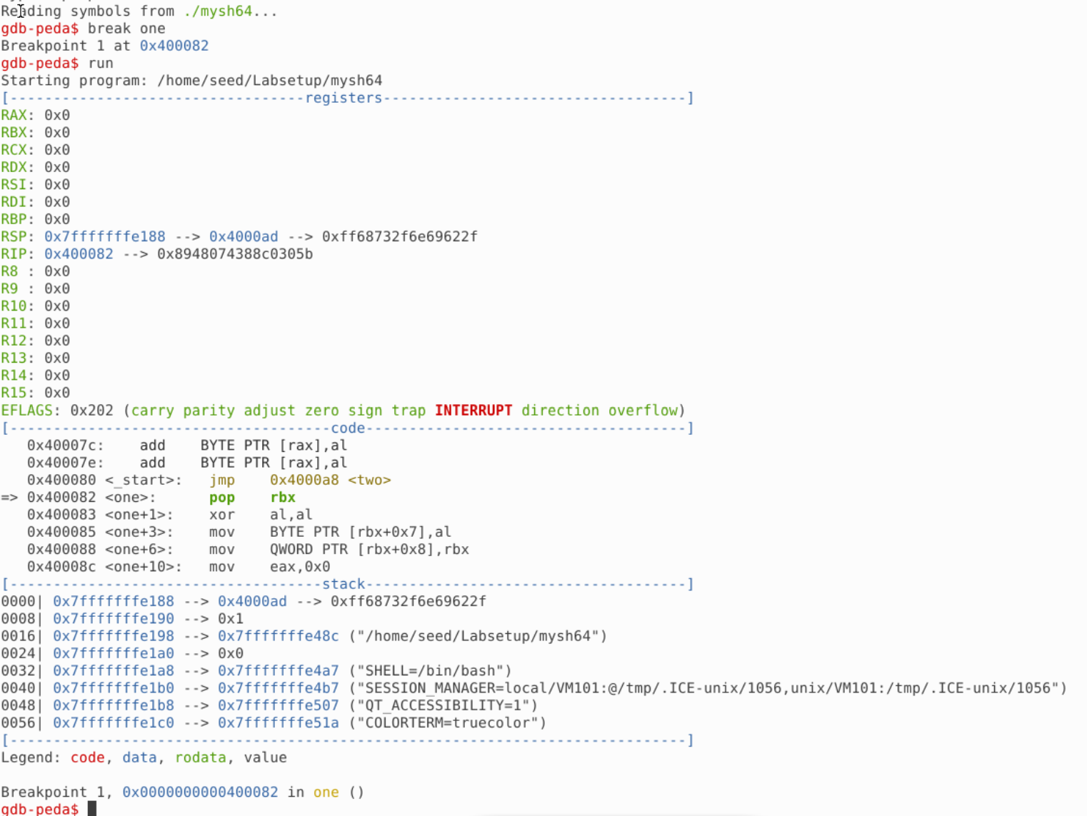 可以发现我们获得了一个 Shell,使用 gdb 调试,观察代码,程序通过 jmp short two 跳转到 two 标签处,接着执行 call one,它会将下一条指令的地址(即 /bin/sh 字符串的地址)保存到栈中的返回地址,那么通过 pop rbx 指令可以将这个地址从栈顶弹出到 rbx 寄存器中就可以获得 /bin/sh 字符串地址: