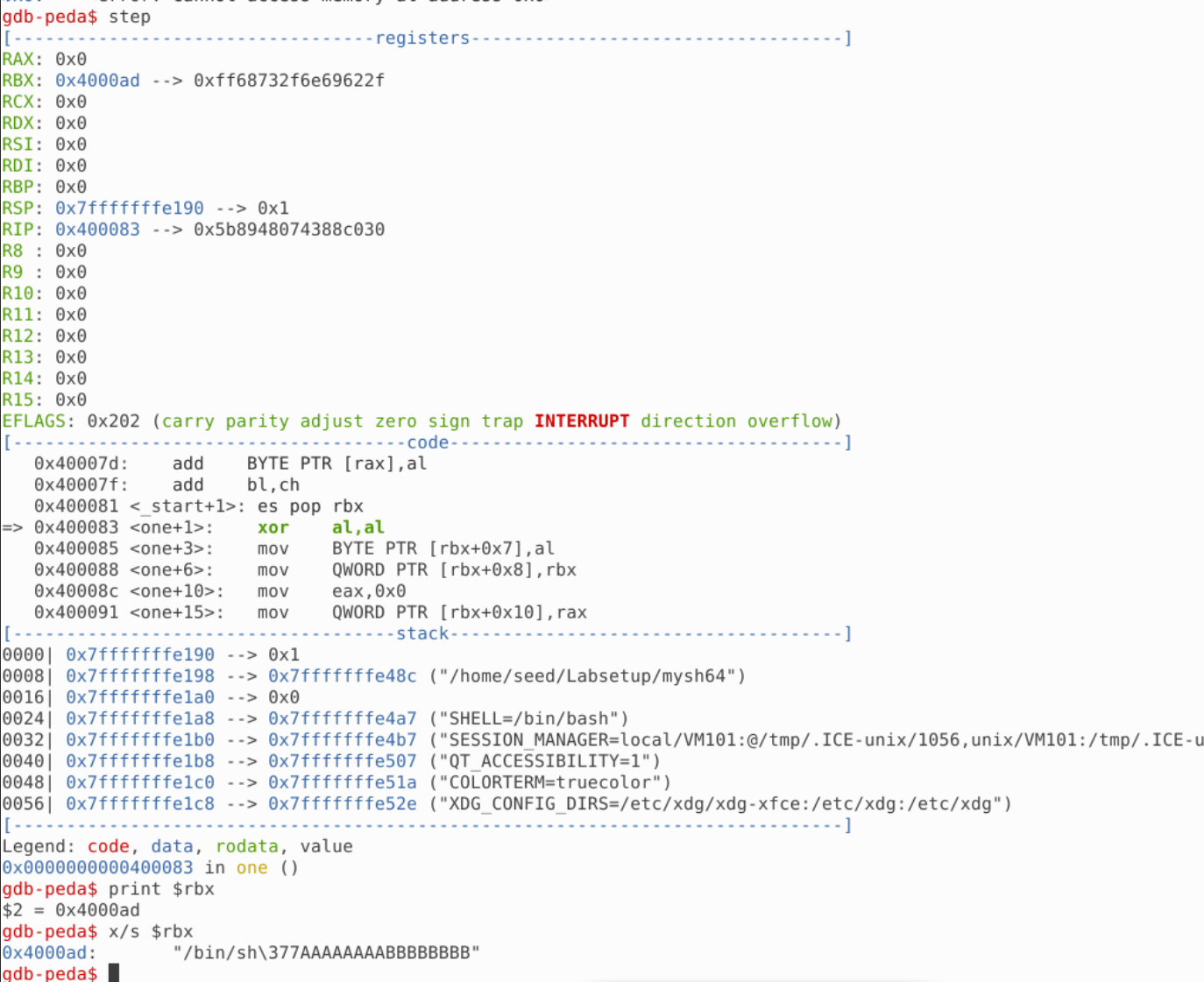 mov [rbx+7], al ; rbx = '/bin/sh\0'
