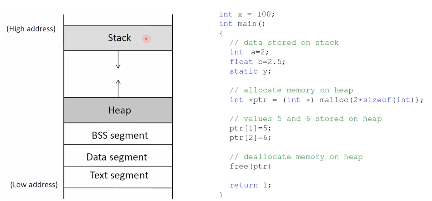 malloc等函数进行分配(例如右侧代码中ptr分配出的两个整数ptr[1], ptr[2]),向高地址增长 - Stack:存放局部变量、函数参数和返回地址等信息(例如右侧代码中的局部变量