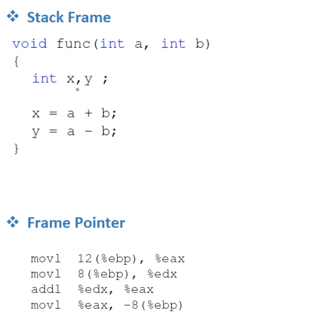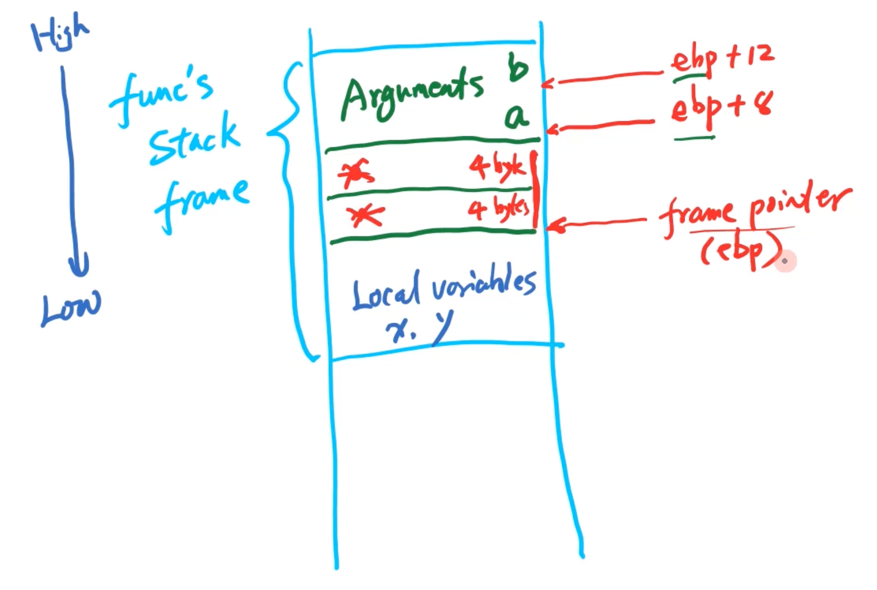 如上图,函数参数 a,b 分别存放在帧指针偏移 8 和 12 的位置(且位置是固定的无法改变,函数的第一个参数总是存放在帧指针偏移 8 的位置,第二个参数存放在帧指针偏移 12 的位置),这也很好解释了上面汇编语言计算 x 的过程