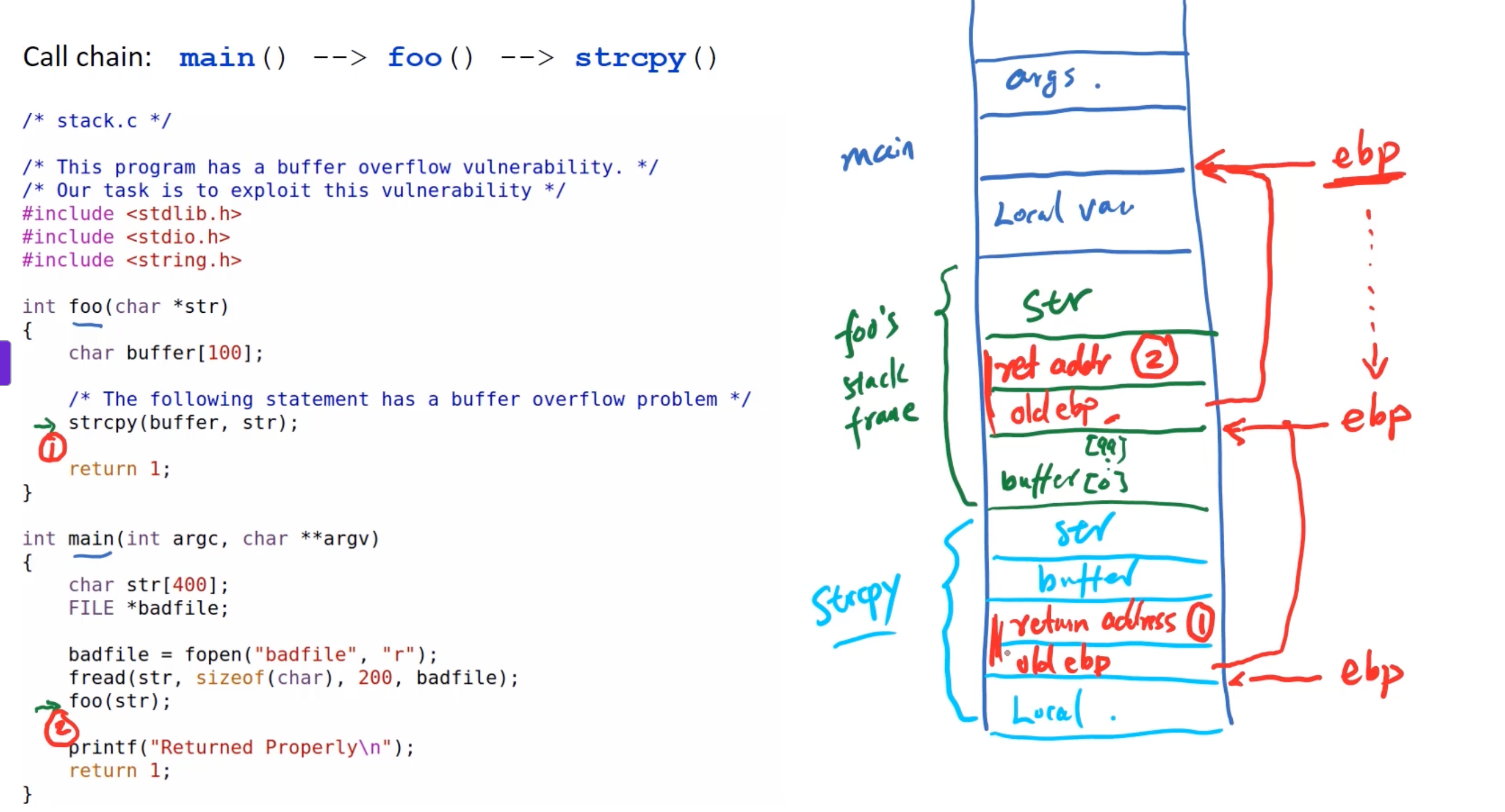 当然,在 foo 函数中我们还需要调用 strcpy 函数,同理,strcpy 函数也会分配一个新的栈帧在 foo 函数之上,并更新 ebp 寄存器指向新的特殊区域的起始位置,同时保存 foo 的 ebp 和 strcpy 执行完后要返回到 foo 函数的指令地址