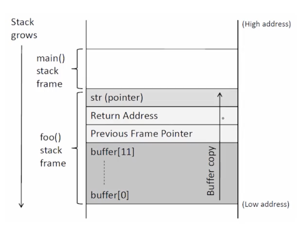 当 foo 函数被调用时,栈上会分配一个栈帧,里面有一个长度为 12 的缓冲区 buffer,但是我们传入的字符串长度超过了 12 个字节,因此在执行 strcpy 函数时,会将超过 12 个字节的内容写入到 buffer 中,这就导致了缓冲区溢出(Buffer Overflow)问题,我们可以画出栈的布局: