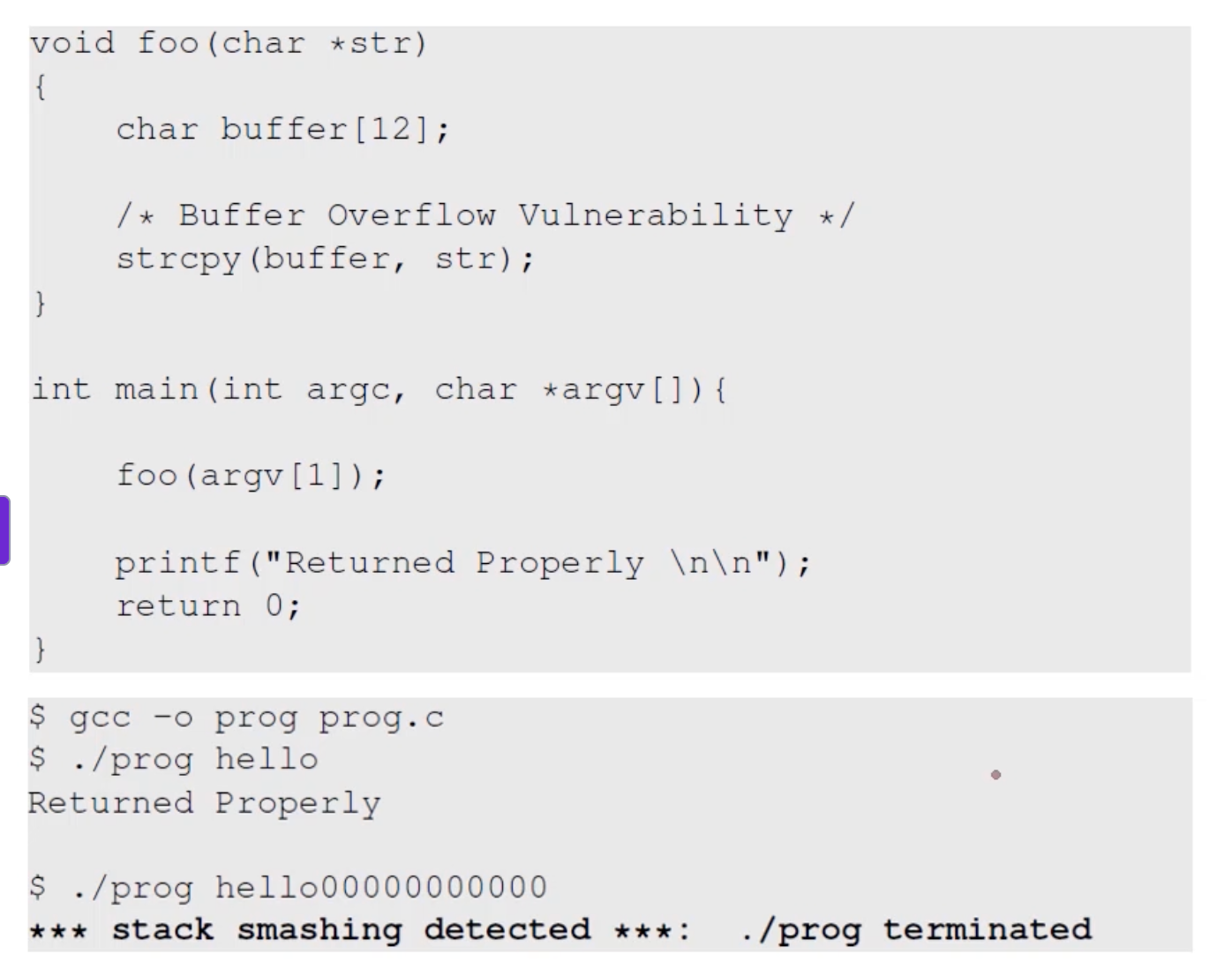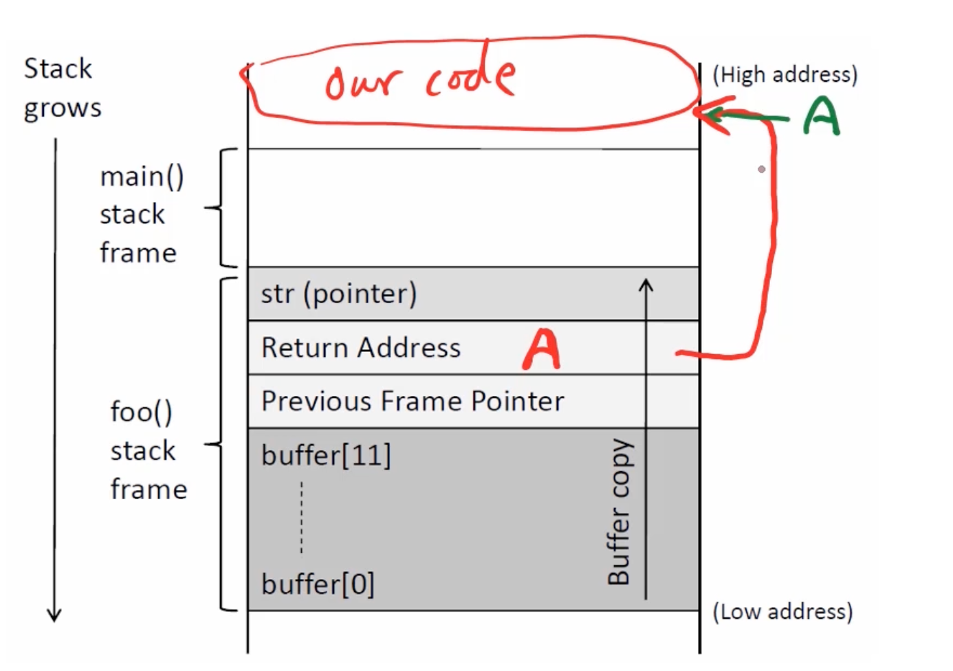 strcpy函数时,栈帧中buffer的内容会被覆盖,导致buffer中的内容变成了This is definitely longer than 12,而这个字符串长度超过了 12 个字节,因此会覆盖掉buffer之后的内容,那么就会覆盖到 old ebp 甚至是返回地址和函数参数,这样就会导致程序崩溃- 一个程序崩溃其中可能的原因就是返回地址被更改,而这个返回地址在栈中是一个虚拟地址,对此会有三种情况: