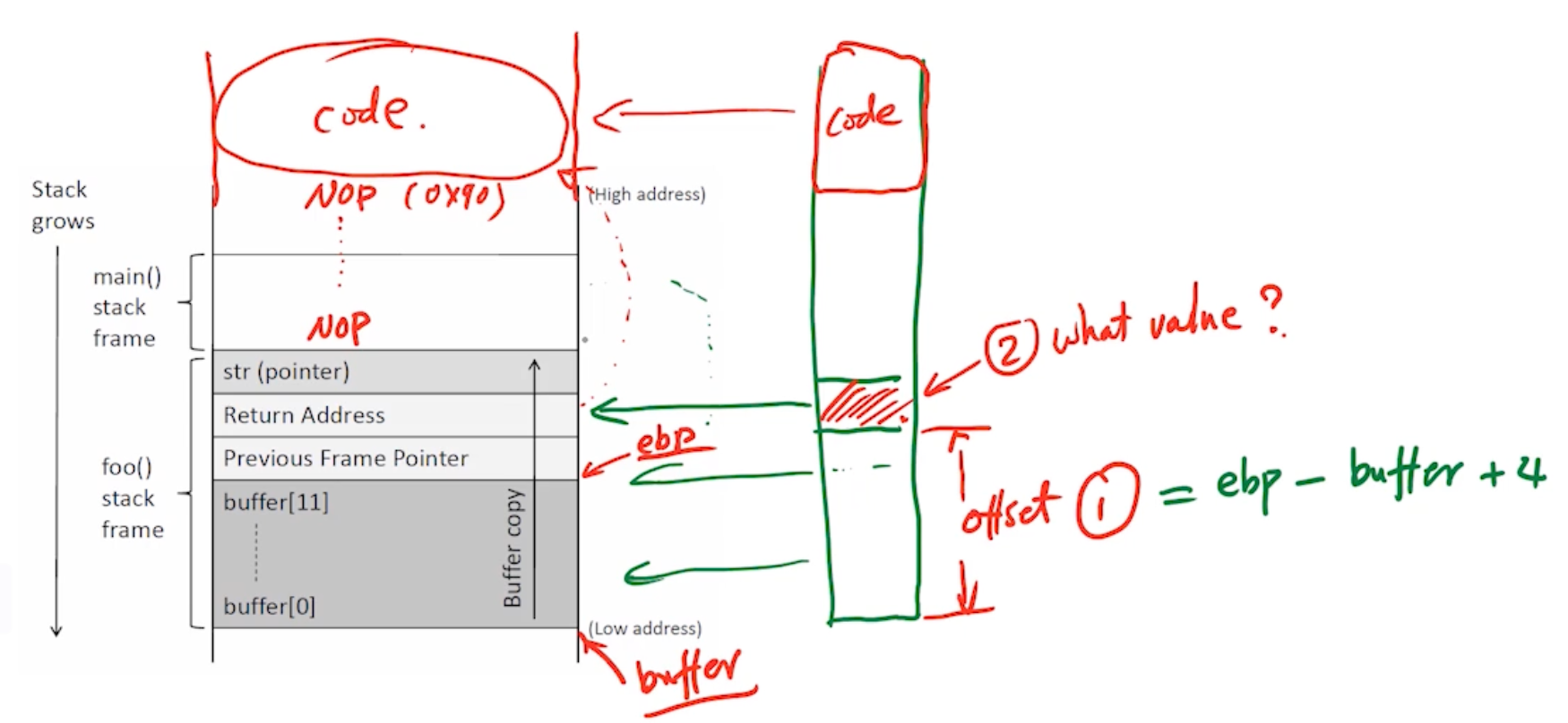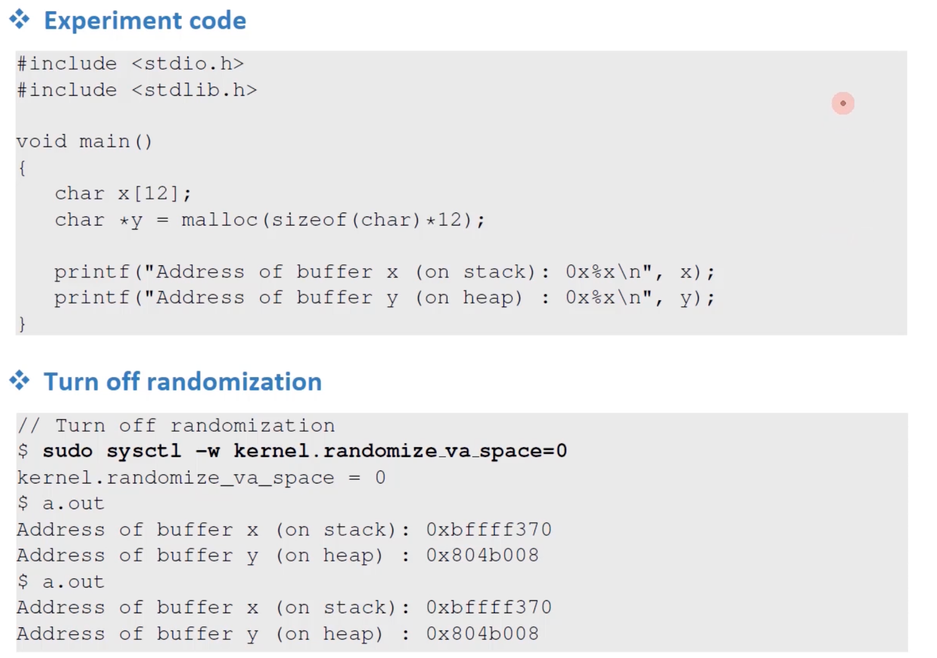对于第一点,偏移量是固定且已知的,但是对于第二点,因为恶意代码的位置是我们决定的,也就是相对 buffer 起始地址的偏移量是已知的,似乎返回地址也是已知的,但是这个值是唯一的,而真实环境下操作系统实施了地址随机化(ASLR,后面会提到),这使得攻击的成功率极低。