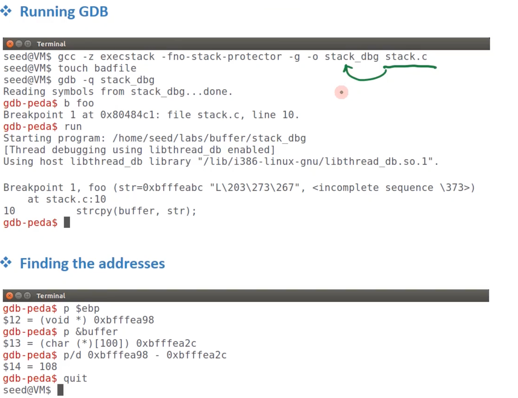 buffer[0]的偏移量,方便我们通过溢出来覆盖返回地址 - 其次,我们将我们需要执行的恶意代码也通过溢出的方式保存在栈上,但是我们还需要知道恶意代码的第一条指令具体的地址,即用哪个值来覆盖返回地址