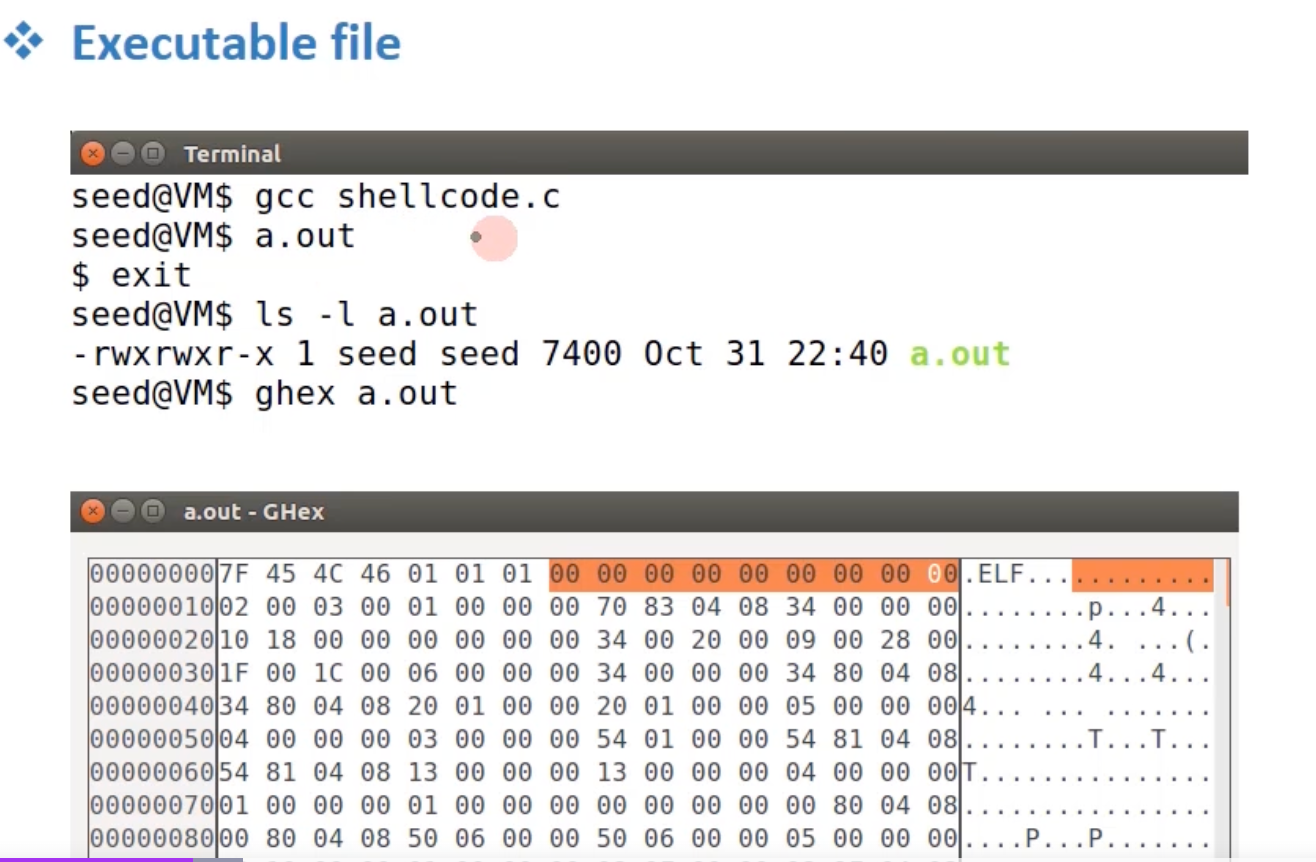 我们将其编译成可执行文件(例如 a.out),就可以使用 ghex a.out 命令来查看其十六进制内容:
