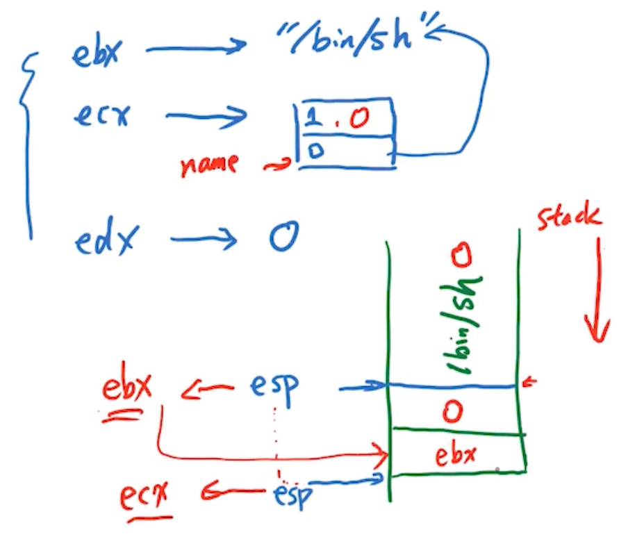 我们可以通过栈指针(Stack Pointer)来处理,对于 ebx 来说,它需要指向字符串 “/bin/sh\0”,因此我们需要将这个字符串放在栈上,此时栈指针所指向的位置即为字符串的地址,将其赋值给 ebx;对于 ecx 来说,它指向的是一个数组,第一个元素是字符串,第二个元素为 0,我们可以直接将 ebx 赋值给第一个元素,此时栈指针所指向的位置就可以直接赋值给 ecx,最后 edx 直接赋值为 0 即可。