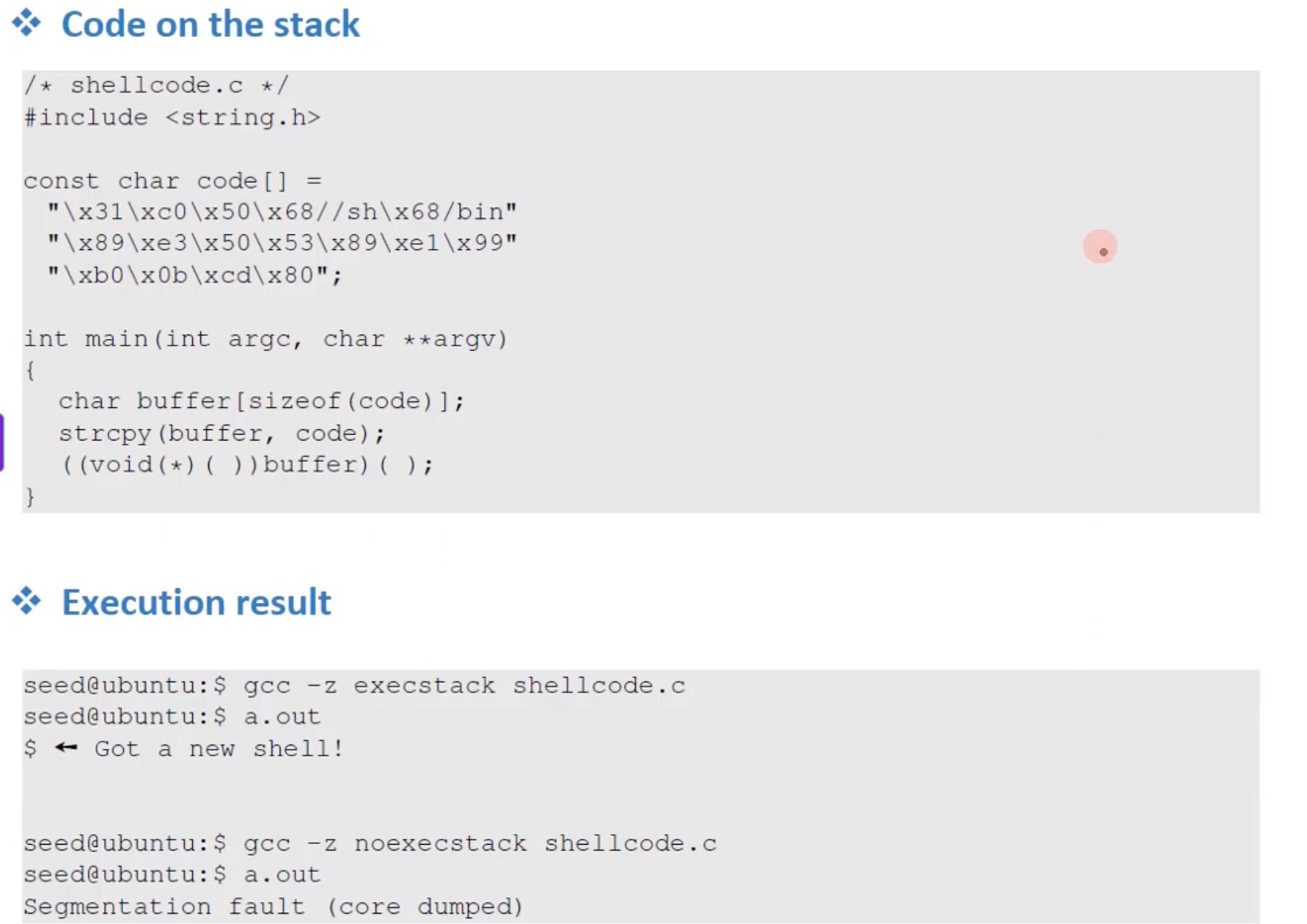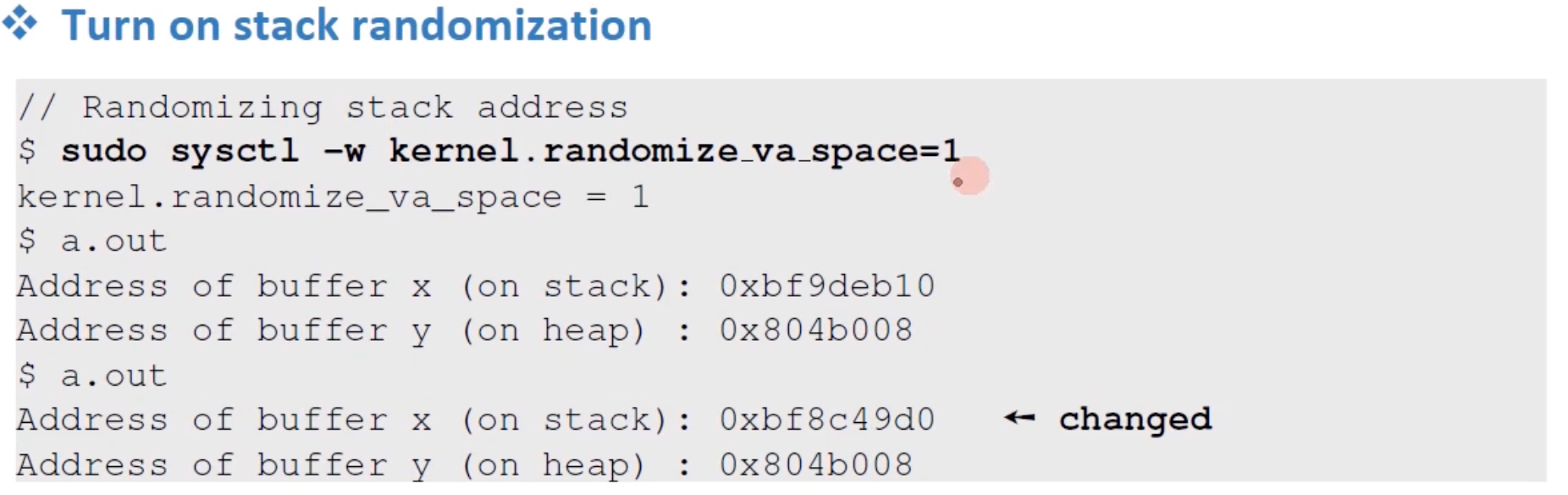 在之前的攻击实践当中,我们通过将恶意代码放在栈上来实现攻击,但是如果我们将栈设置为不可执行,不能运行任何从栈上来的东西,那么即使将代码放在栈上也被视作是一堆数据,无法在栈上执行恶意代码,这样就可以防止 Buffer Overflow 攻击。
