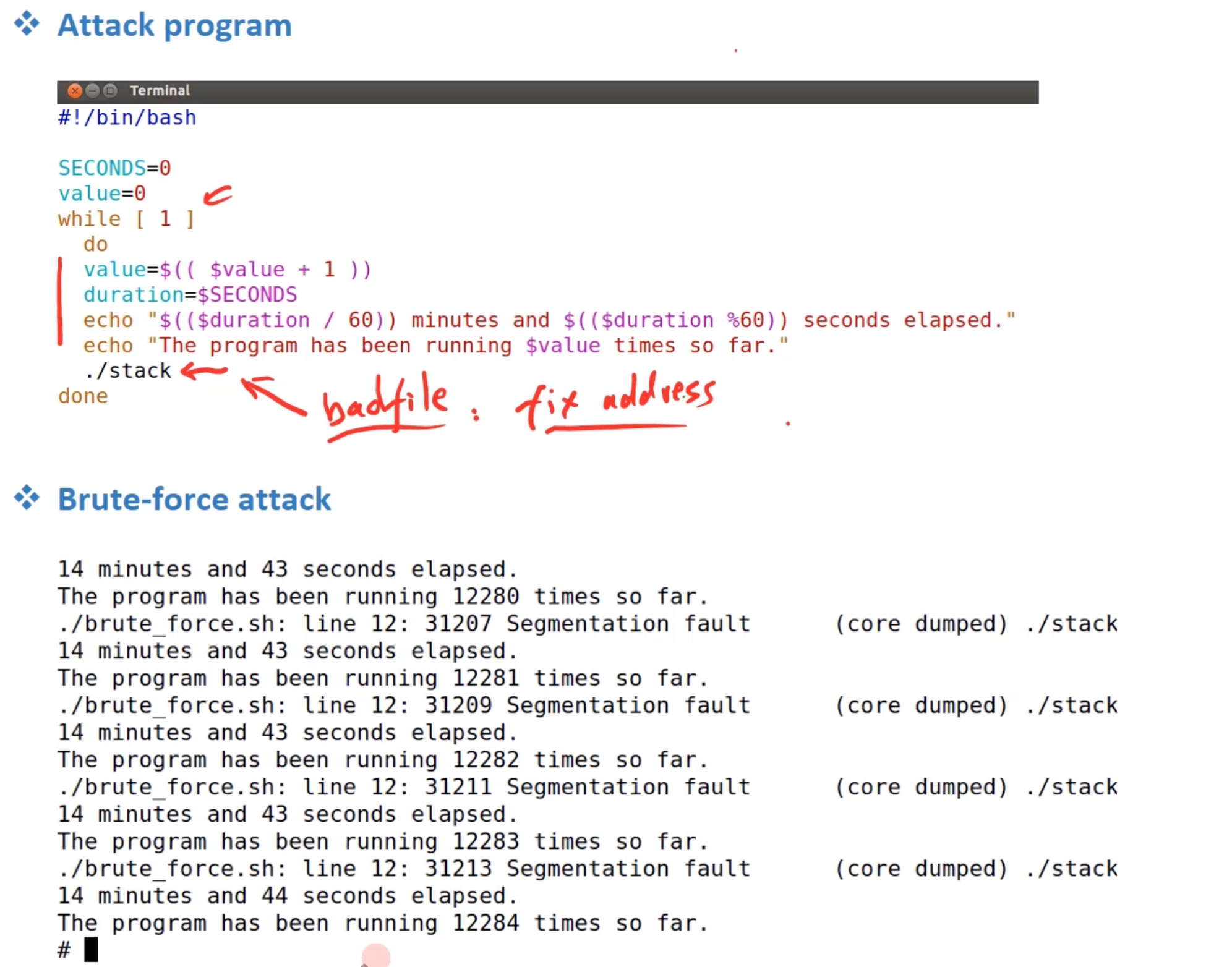在之前的实践中,为了获取 ebp 的值,我们使用了 gdb 调试器来获取,但是在实际攻击中,我们是不会获得源代码的,更不可能通过编译加调试的方法获取 ebp 的值,因此我们才需要猜我们的恶意代码在哪里。但是在这之前,操作系统给栈分配内存时,这片内存在进程的位置是固定的,那么猜测的难度就取决于栈有多深,一般只有递归程序才会有很深的栈,再加上我们有 NOP 指令的帮助,猜测的成功率就会大大提高。