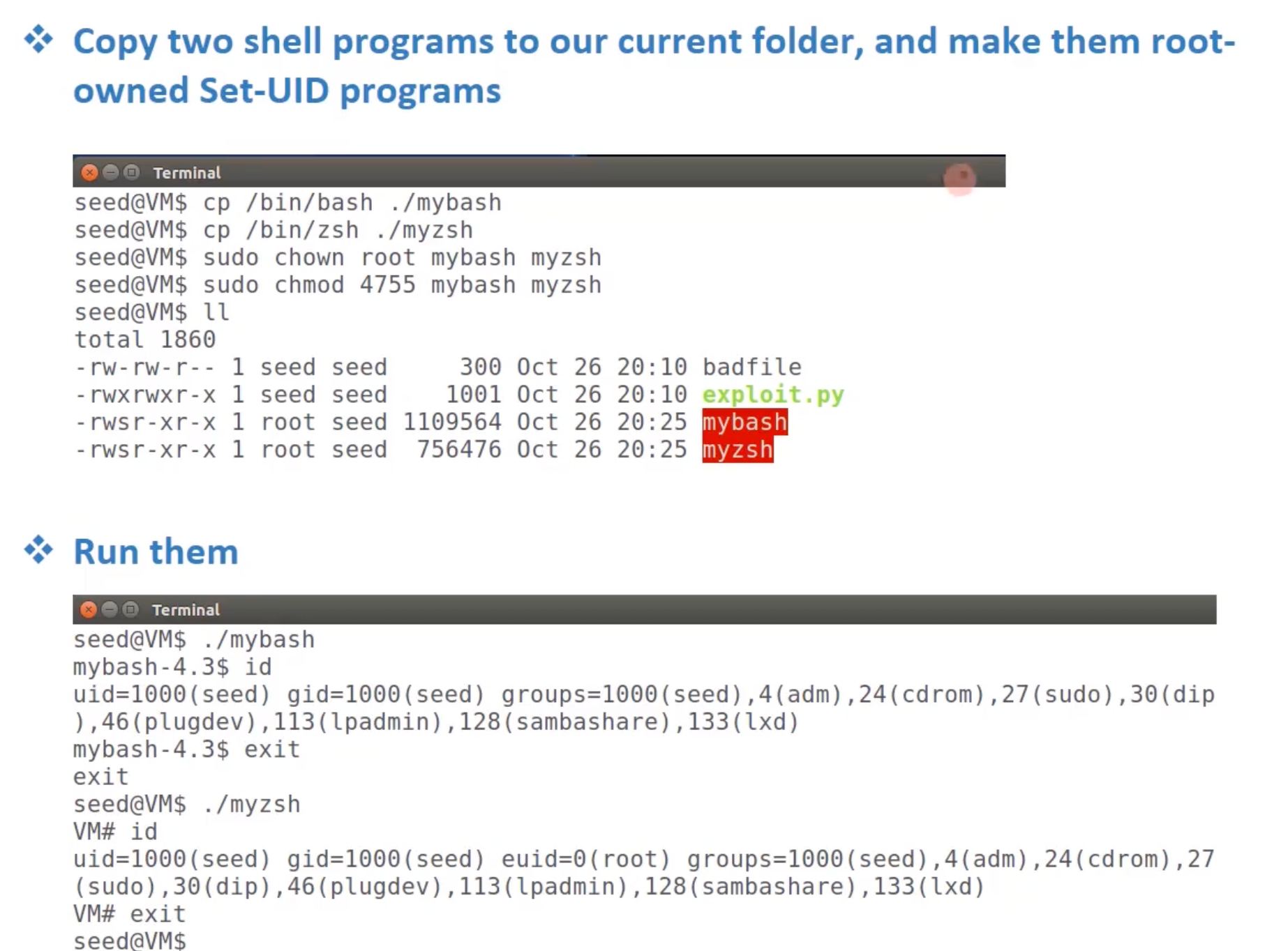 如我们之前所说,一般的攻击都会以获取 Shell 为目标,最粗暴的防御方式就是禁止在一些权限高的进程(例如 Set-UID 进程)中执行 Shell 程序,判别方法也非常简单,只要 Shell 程序判断 euid 和 ruid 是否相等,如果相等就可以执行 Shell 程序,否则就让 euid 和 ruid 相等,实现权限降级。实验证明,bash 有这个机制而 zsh 没有这个机制: