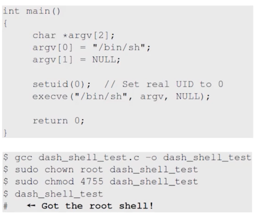 在我们的攻击当中,我们攻击的是一个 Set-UID 程序或者是一个 Server 程序,这些程序在运行时已经拥有了 root 权限,因此我们可以通过 setuid(0) 来提升权限。