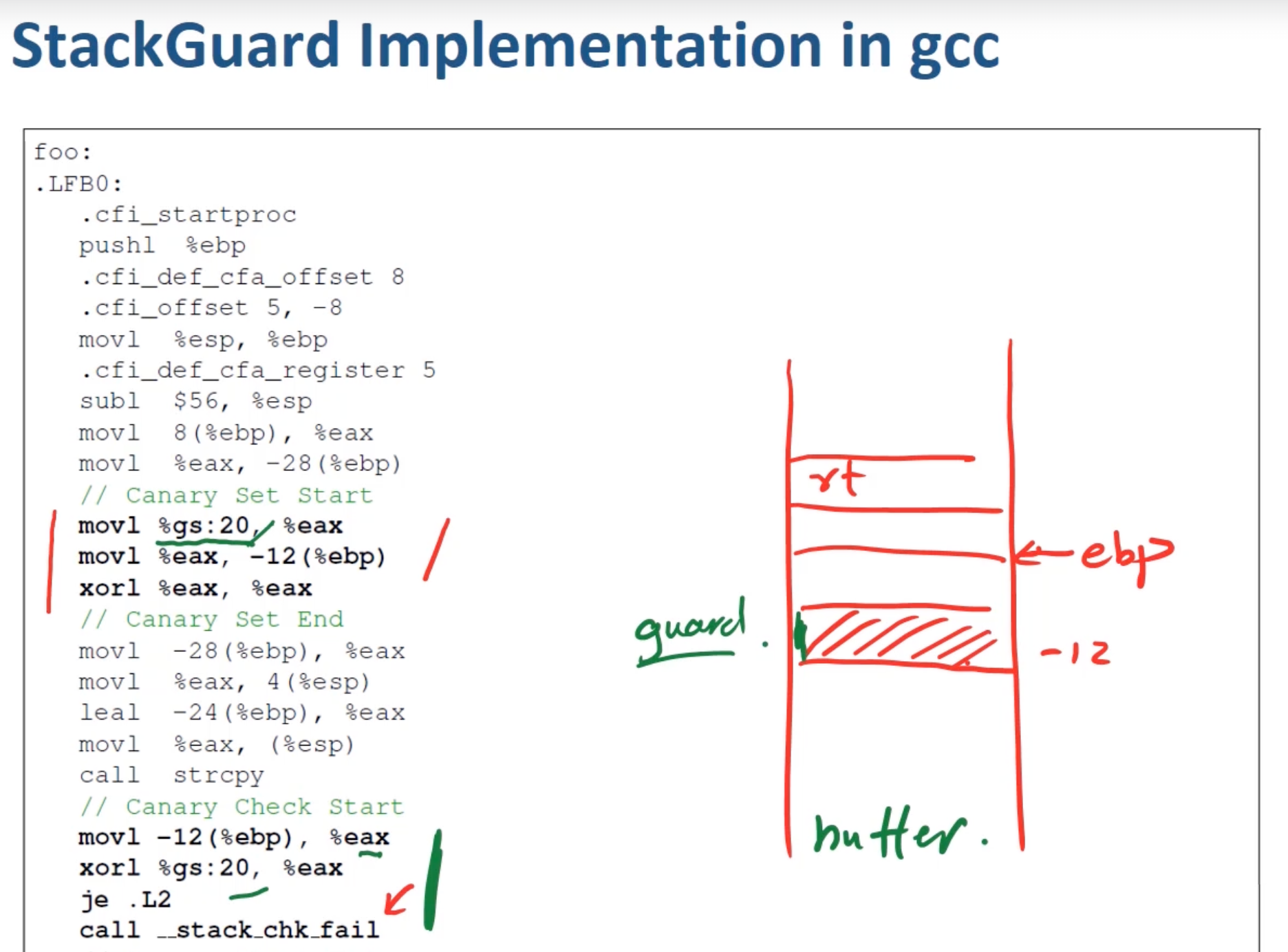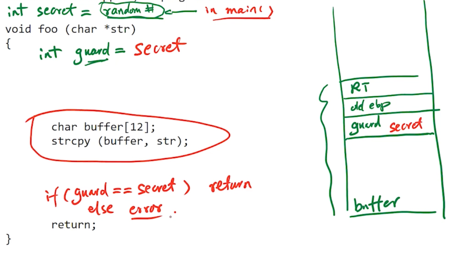 从实现上来说,我们需要定义一个全局变量 secret(全局变量是保存在堆上而不是栈上的,这样就防止每次调用一个函数时都要重新更新 secret 的值),然后在函数调用时将 secret 的值赋值给 Guard,并在函数返回时检查 Guard 的值是否被修改,如果被修改了就说明发生了 Buffer Overflow 攻击,此时程序会终止。
