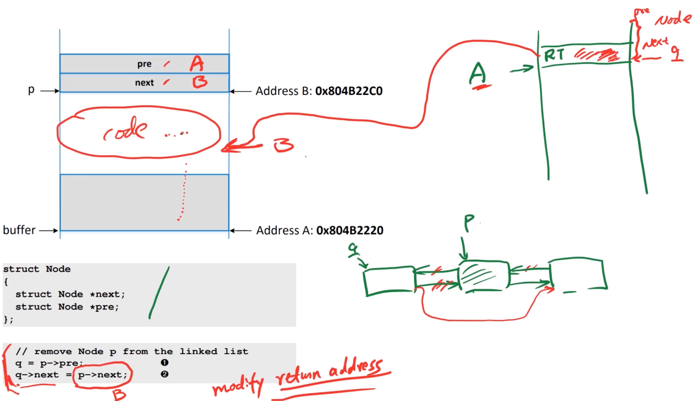 这个函数调用是保存在库中,在释放内存时会自动调用,假设我们已经知道了返回地址的位置,那么我们可以通过 Buffer Overflow 让 p -> pre 为这个位置,p -> next 为恶意代码的地址,那么返回地址即为 q -> next,根据上面的代码我们就可以改变返回地址了,原理图如下: